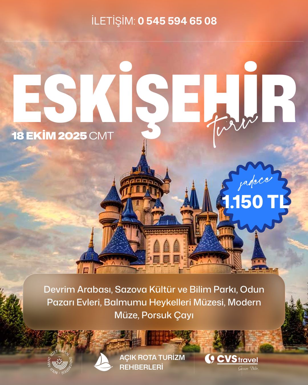 Bolu Abant İzzet Baysal Üniversitesi Açık Rota Turizm Rehberleri Topluluğu, 18 Ekim tarihinde Eskişehir’e düzenlediği günübirlik geziyle öğrencilerine hem eğlenceli hem de öğretici bir deneyim sundu. Katılımcılar, Eskişehir’in kültürel ve tarihi zenginliklerini yerinde görme fırsatı bulurken, topluluk ruhunu pekiştiren keyifli anlar yaşadılar.
