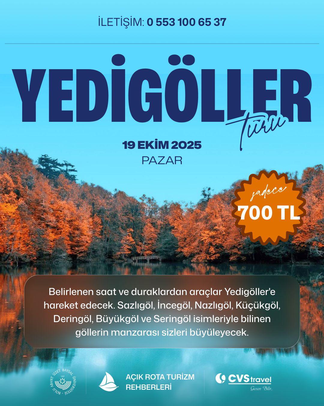 Bolu Abant İzzet Baysal Üniversitesi Açık Rota Turizm Rehberleri Topluluğu, 19 Ekim tarihinde Yedigöller’e düzenlediği günübirlik doğa gezisiyle sonbaharın büyüleyici atmosferini öğrencilerle buluşturdu. Renklerin dans ettiği orman yollarında gerçekleşen bu doğa yolculuğu, katılımcılara hem huzur hem de unutulmaz anılar sundu.